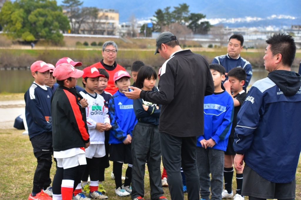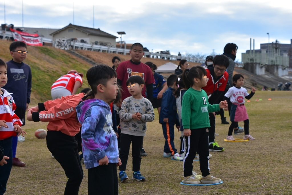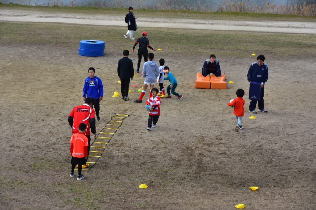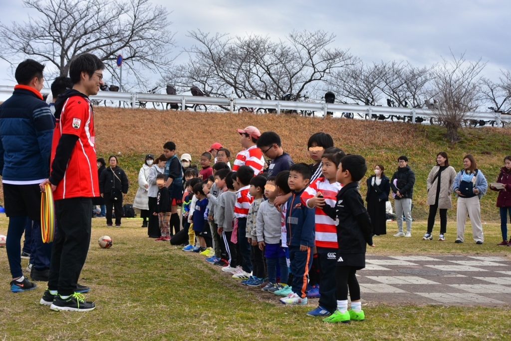 曇天の割には少し春めいたこの日、幼稚園~小学5年生までたくさんのお子様が「体験教室」に参加してくれました。各学年に分かれてラグビーに触れ合う機会と位置付け開催しました。ラグビーボールやタックルバッグを使って少しだけラグビーを感じてもらうプログラムも用意。笑顔溢れる体験教室となりました。そして、学年間の交流も考慮して、小5や小6の先輩団員が小さな子供達を率先してサポートをしてくれました!!